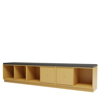 The functional Rest III bench from Scandinavian manufacturer Montana offers both comfort and storage options. Four open compartments and two drawers provide sufficient storage space in the hallway, bedroom or living room. The bench is made even more comfortable by the harmoniously matching seat pad.