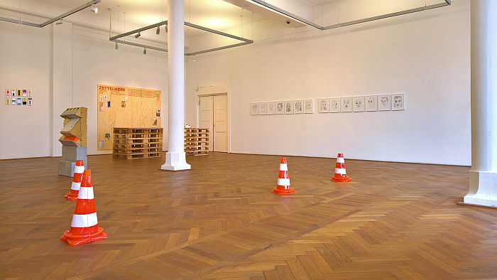 In addition to such reflections on the transiency of daily routines, täglich geöffnet also reflects on some of the more permanent banality of our Alltag. With Pylonen, for example, Julia Tiefenbach has created a series of glass traffic cones which through marking off an area of nothing, very neatly remind us that the dangers and pitfalls of everyday life needn't be major, might just be dribbling toothpaste down your front, or forgetting to buy milk; in the short film ritornel Zeitbasierte Künst student Binha Haase documents the (apparently) banal life of a North Korean music student in Berlin, a banality which however not only hides a much more complex reality, but a banality which relies on all manner of structures, fears and rituals in order to do such, structures, fears and rituals we all develop to maintain our own banality. Then there is Hole-o-Fame by Malerei/Textile Künste student Melanie Schulz.
