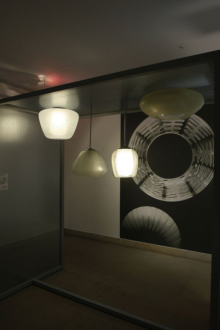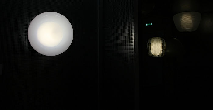 That Wilhelm Wagenfeld's 1924 lamp was not only designed to be industrially produced, but that largely from standardised and/or off-the shelf, components being demonstrated in Wilhelm Wagenfeld: Lamps by an exploded glass version which allows a detailed study of the construction; and in many regards this standardised, off-the shelf construction approach is continued and repeated in the exhibition design from Jakob Gebert and Hanna Krüger with its use of industrial panels as industrial panels, and a design concept also representative of a photo showing Wagenfeld at work in Stuttgart in his "Werkstatt Wagenfeld" research laboratory, and in which lamps are seen hung from just such panels, and thus, when not recreating Wagenfeld's creative environment, certainly allows for an understanding, and feeling, of it. Yes, the panels do give the marginal impression of being in a trade lighting shop, but also allow for an easy, accessible and uncluttered view of the essentials, without unnecessary distraction; much like Wagenfelds' own design. The exhibition design and display concept being further enhanced and intensified by the fact that some lights are on and some off: on the one hand a technical necessity, not all the older lamps can or should be turned on, but also important to underscore the duality of a light's function, that while a lamp must illuminate, and that in a useful, practical and functional manner, it also has to stand in a space when not illuminating it. And the one/off thereby allows for a very pleasing and regular switch of focus from practical to formal aspects, and thereby underscoring not only their relationship but how Wagenfeld understood and achieved the necessary balance between the two components of a lights character.