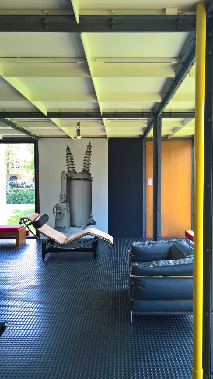 Planned and constructed on the basis of Le Corbusier's 1950s Brevet 226 x 226 x 226 modular construction system, the only realisation of that system, the Zürich pavilion is also the only glass and steel frame construction realised by Le Corbusier; does however feature several aspects oft used by Le Corbusier including a strict quadratic geometry, stilts to create free-floating elements, prominent colour and exposed concrete. For all the steel and glass there is also an awful lot of exposed concrete. And while having something unquestionably, adamantly, formal, it is also a very playful work, with its portal-esque doors, galley-esque kitchen and steep, narrow stairwells, it has the unmistakable feeling of a ship; if you will an ironic luxury liner for a landlocked nation, or a pleasure steamer harboured on the banks of the Zürichsee amongst a flotilla of Art Nouveau villas. And a work which when compared with Le Corbusier's first building, the Art Nouveau Villa Fallet in his native La Chaux-de-Fonds, and which in many regards could itself have stood on that site in Zürich, is a work that also very neatly surmises the voyage Charles-Édouard Jeanneret took to Le Corbusier.