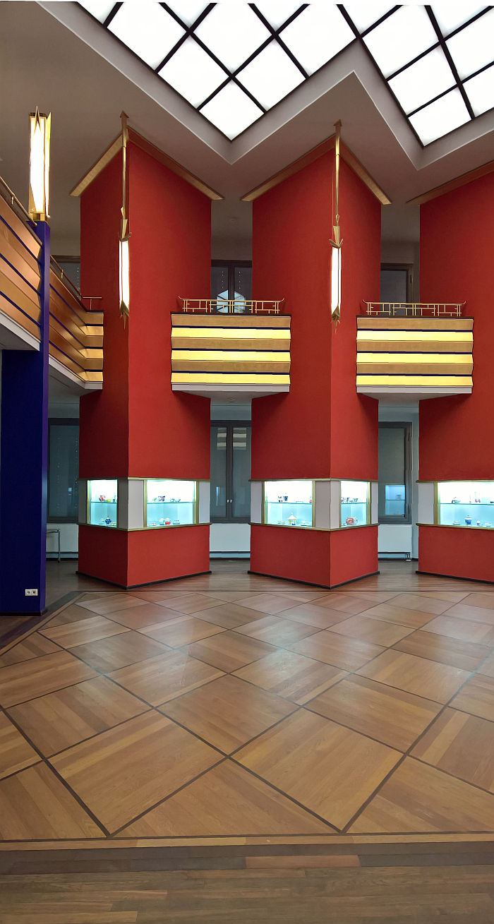 In preparation for a showcase which presents porcelain in vitrines of the same era, vitrines conceived in the same understandings of evolving realities, and vitrines and porcelain which in their accord with one another, and in their melodic, rhythmic and harmonic contrast to all that outwith the Pfeilerhalle provides, for a succinct introduction to one expression of early 20th ceramics. And which in doing so helps underscore that Art déco was but one expression of the early 20th century, a roar of colour and vibrancy against the rational, restrained, Sachlichkeit, of the Functionalists, and a positive, affirming, roar of hope in the bright new future that awaited Europe.......
