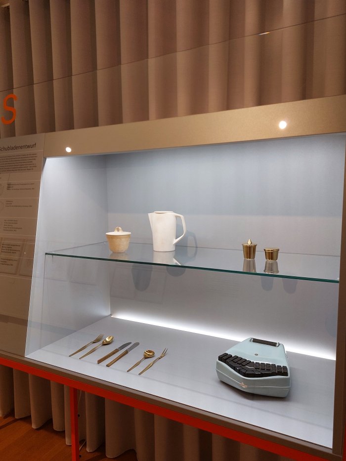 Presenting itself pleasingly free of the all too obvious, yes the lamp is there, but its presence is actually required by law in any Wilhelm Wagenfeld exhibition5, and that in a pleasingly reduced, and for all colourful presentation format, colour, as one learns to appreciate in Wilhelm Wagenfeld A to Z, wasn't something Wagenfeld particularly employed, not that Wagenfeld was achromatic, but he was very much one for more subdued hues than the forthright orange of the exhibition cases, Wilhelm Wagenfeld A to Z is a very accessible, clearly formulated and intelligently conceived exhibition, and for all an exhibtion pleasingly free of theory, or the feeling you need to follow an argument, indeed when the curators note under Zeitlos of Wagenfeld's 1937 glass baking dish for Schott & Gen. Jenaer Glas, "Wagenfeld designed this baking dish more than 80 years ago. It would be an excellent addition to the range in a present-day household goods store, despite its old age!", it's a very nice step away from a curator explaining something through theory and instead expressing a personal opinion. The word "Discus?" has been forgotten at the end of the statement, but is very present in your reading of it. And thus Wilhelm Wagenfeld A to Z is an exhibition, a space, you can relax in, take your time in, jump back and forth within, discover at your will, in a manner to your pleasing, in a manner meaningful to yourself, and as you do you can attempt to fill in the missing letters: aside from the aforementioned H....... ¿Humorous?, one finds gaps at J....... ¿Jucker? , R....... ¿Restless?, T....... ¿Technology?, X....... ¿?, Y....... ¿Yucca?, or Q......., Q......., Q.......