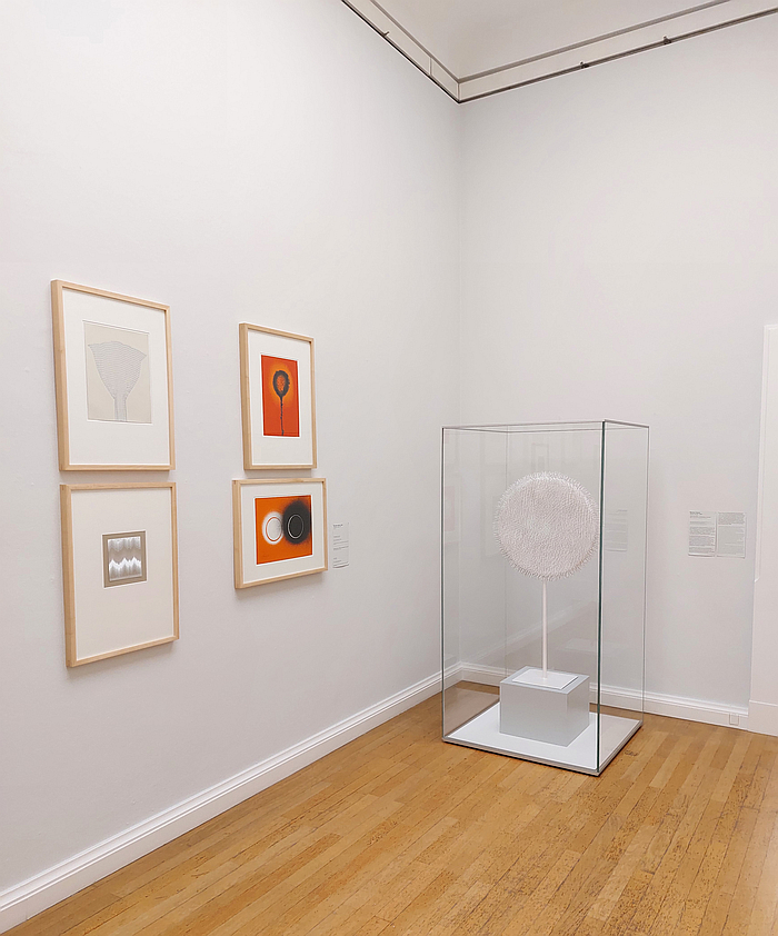 Contemporary art, if of a different contemporary, also represented by works from the Zero collective, specifically by the group's three most defining members, Heinz Mack, Otto Piene and Günther Uecker, the latter whose 1964 nail object White Sun, a work from the Kunstsammlungen Chemnitz collection that stands in Beyond Geometry like some albino sunflower, offers differentiated perspectives on the above noted discrepancy between the lightness and minimalism of the agency of Frei Otto's constructions and the material usage and complexity of their realisation. And a Zero with whom, one learns, Frei Otto and many of his architectural contemporaries were in contact, not least on account of the similarities of their work, the similarities of their responses to the contemporary their work embodied and advocated, thus in doing so helps bring a Heinz Mack, an Otto Piene and a Günther Uecker into the discussion, helps move the discourse beyond Frei Otto and Kengo Kuma.