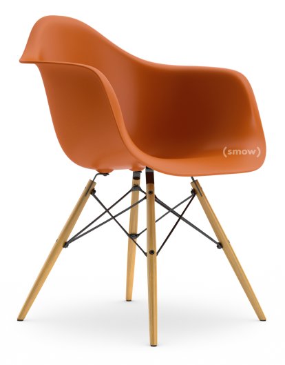 The wooden legs of the Vitra Eames DAW are stained maple. The old reddish stained version was produced until the end of 2008 and is no longer available. Since 2009 the maple wood has been stained yellow. In 2013 Vitra also released dark maple and black maple versions and in 2016 added a honey stained ash version.