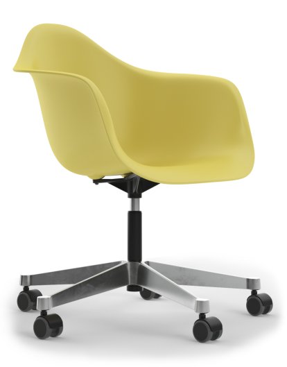 The Eames plastic chairs, including the Eames PACC, belong to those few objects in the history of furniture design that have not only enjoyed a great popularity but effortlessly transform design classics into everyday lifestyle objects. The basic idea for the Eames chair family grew out of a design competition organized in 1950 by the Museum of Modern Art, New York, the "International Competition for Low cost Furniture". For their series of moulded fibreglass chairs Ray and Charles Eames were awarded second place. The series consists of Eames armchairs and Eames side chairs, with a range of bases and available in numerous colours. The Vitra PACC combines an Eames A Shell with a chrome plated five-foot base with casters and is with the accompanying PSCC the work horses of the Eames chairs.