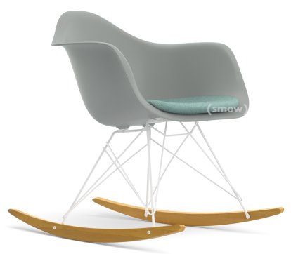 The compact rocking chair RAR with upholstery by Vitra is similar to the classic Eames RAR rocking chair, but comes either with seat upholstery or fully upholstered, and thus has minimally adapted dimensions, adapted dimensions necessitated by the statics of the iconic rocking chair. The Eames RAR chair, short for Rocking Armchair Rod Base, belongs to the legendary family of the original Eames Chairs by Vitra and achieves a new comfort thanks to its upholstery. The RAR by Charles & Ray Eames is a chair full of accents: an organic plastic seat shell meets pleasant fabric, while the metal base is contrasted with rockers in warm wood tones. And thus the RAR with seat upholstery is a rocking chair full of contrasts, yet contrasts which combine to make the design classic a harmonious, elegant piece of living room furniture. Since 2024 Vitra has manufactured the Eames Plastic Chair seat shells from resource-saving recycled material.