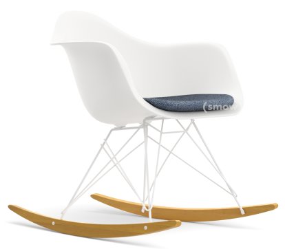 The compact rocking chair RAR with upholstery by Vitra is similar to the classic Eames RAR rocking chair, but comes either with seat upholstery or fully upholstered, and thus has minimally adapted dimensions, adapted dimensions necessitated by the statics of the iconic rocking chair. The Eames RAR chair, short for Rocking Armchair Rod Base, belongs to the legendary family of the original Eames Chairs by Vitra and achieves a new comfort thanks to its upholstery. The RAR by Charles & Ray Eames is a chair full of accents: an organic plastic seat shell meets pleasant fabric, while the metal base is contrasted with rockers in warm wood tones. And thus the RAR with seat upholstery is a rocking chair full of contrasts, yet contrasts which combine to make the design classic a harmonious, elegant piece of living room furniture. Since 2024 Vitra has manufactured the Eames Plastic Chair seat shells from resource-saving recycled material.