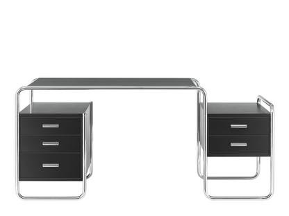 One of the best known representatives of Marcel Breuer's legendary steel tube family the Thonet S 285 desk is distinguished by a unique, harmonious combination of chrome plated tubular steel and wood. Both the table top and storage elements are so embedded in the elegant steel frame that they seem to float.