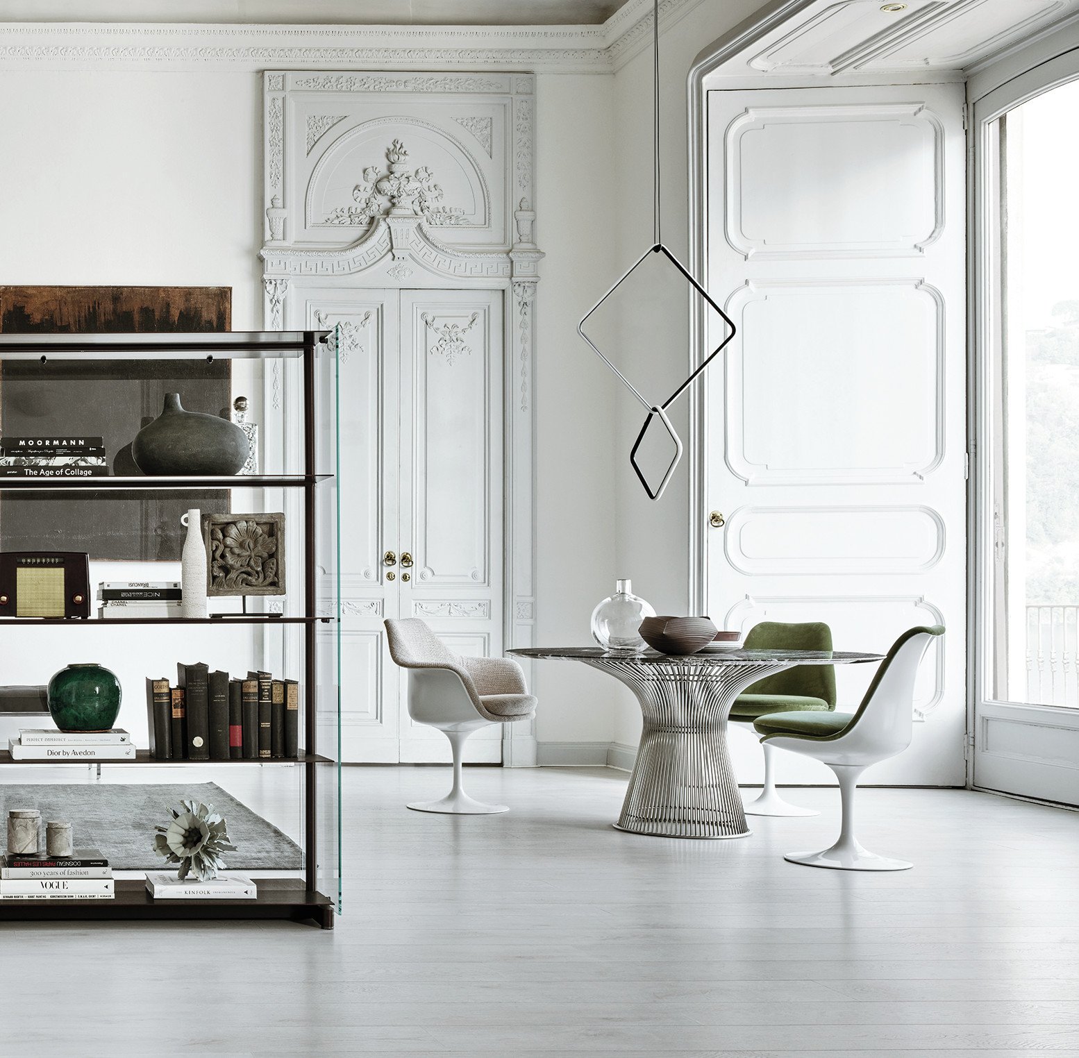 The Saarinen tables are the most obvious addition to the Tulip Chairs, as together they form a consistent design concept. The versions with a marble top in particular look elegant and timeless. Another option is the Platner dining table by Warren Platner; with its wire construction and curved shapes, the Platner table matches the Saarinen chairs well in terms of material and design, but at the same time sets its own sculptural accent.
