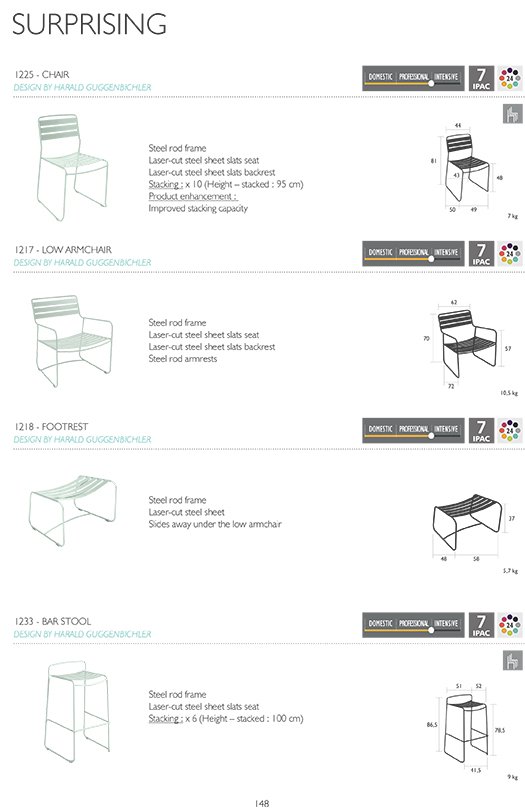 | Care | A mild, neutral detergent on a damp, warm cloth should be used for cleaning. Scratches or light rust can be corrected without the need for sanding with the special retouching pens and/or sprays from Fermob. Apply a polish (liquid or pasty) to stainless steel parts as soon as the first traces of rust appear. The faster such interventions, the less rust will spread. |