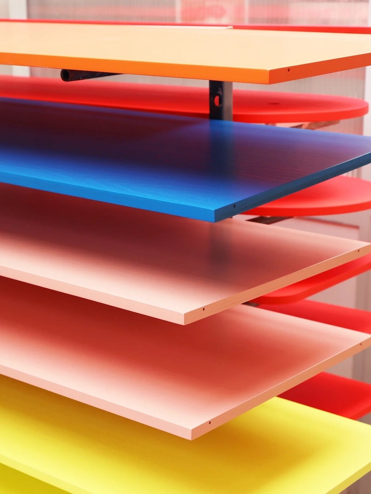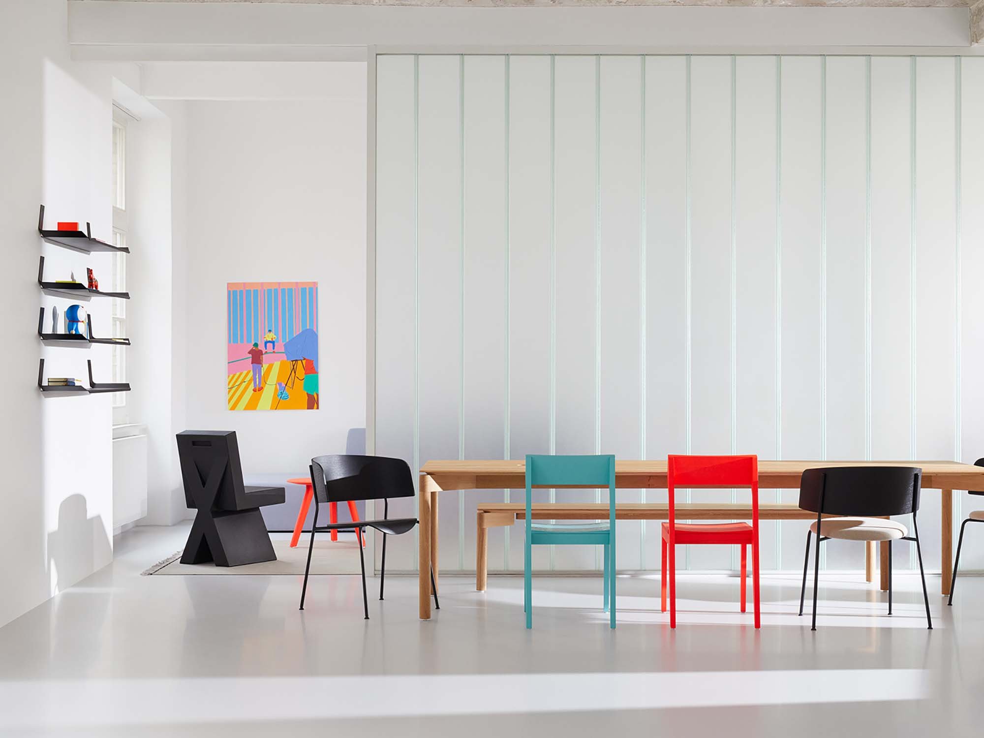 A selection of signature products from OUT with the Schulz chair in fluorescent red and emerald