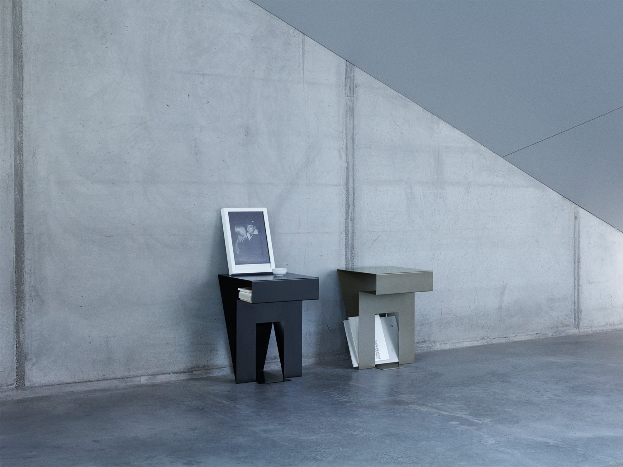 The design of the minimalist Neumann side table plays with geometric shapes