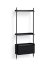 | Material | Shelves: sheet steel, black powder-coated Suspension rods: steel, chrome-plated Coat rail: extruded aluminium, with die-cast aluminium knobs Wire Basket: Steel rod and wire, black powder coated Cupboard: sheet steel, black powder-coated with aluminium door with magnetic closure Connectors: aluminium Supporting columns: Aluminium, black anodized with a satin finish and plastic end cap/gliders |