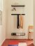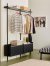 Material | Shelves: sheet steel, black powder-coated Suspension rods: steel, chrome-plated Coat rail: extruded aluminium, with die-cast aluminium knobs Wire Basket: Steel rod and wire, black powder coated Cupboard: sheet steel, black powder-coated with aluminium door with magnetic closure Connectors: aluminium Supporting columns: Aluminium, black anodized with a satin finish and plastic end cap/gliders |