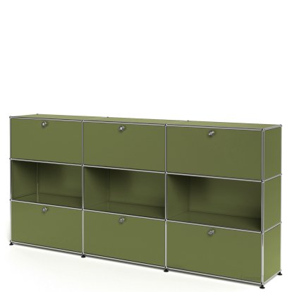 USM Haller Highboard XL, Customisable, Olive green RAL 6003, With 3 drop-down doors, Open, With 3 drop-down doors
