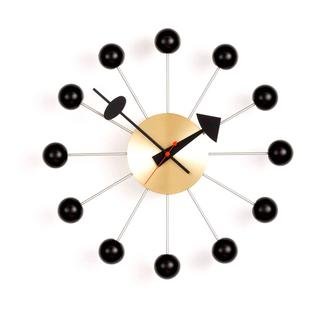 The defining aspect of the Vitra Ball Clock: The interplay of twelve rustic wooden balls and small metal braces that shoot from the middle body. Depending on the version selected the wooden balls are either left natural or painted black or multicoloured, the strut and the body, which also houses the high-quality quartz movement, are made of metal. In the noble variant of the George Nelson clock with black painted wooden balls is the corpus is brass. The colourful versions of the Vitra Ball Clock radiate a charming a touch of naivety which contradicts the exactness with which one usually associates a clock: thus making checking the time a moment of pleasure. Like the other Vitra Wall Clocks the Ball Clock is largely manufactured by hand and in accordance with the Swiss manufacturer's principles of sustainability.